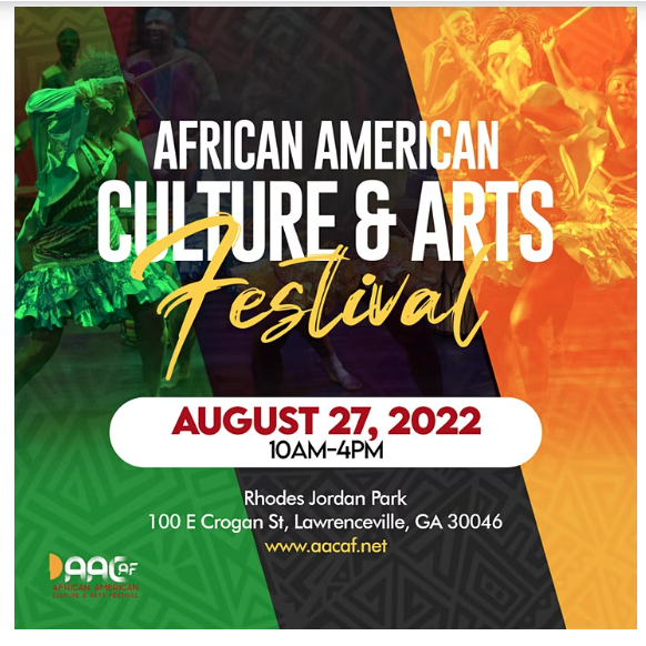 Come join us on August 27, 2022 from 10 AM to 4 PM as we host our second annual African American Culture and Arts Festival at Rhodes Jordan Park, in Lawrenceville, GA. This will be a free event, and all are welcome to come and enjoy our cultural festival! This will be an open-air family friendly festival that will be held in the park right next to the lake. We will have live performances throughout the day by local artists, singers, poets and dancers that will give attendees an opportunity to experience the talent and creativity of our local African American artists. We will have food trucks on site, and you will have an opportunity to meet and support local vendors seeking to offer culturally relevant products and services that cater to the African American community. So, wear some comfortable shoes, bring a lawn chair or blanket and come spend a day with us at the park. Vendors and Food Trucks wishing to participate in the festival can register at https:/aacaf.net/vendors.