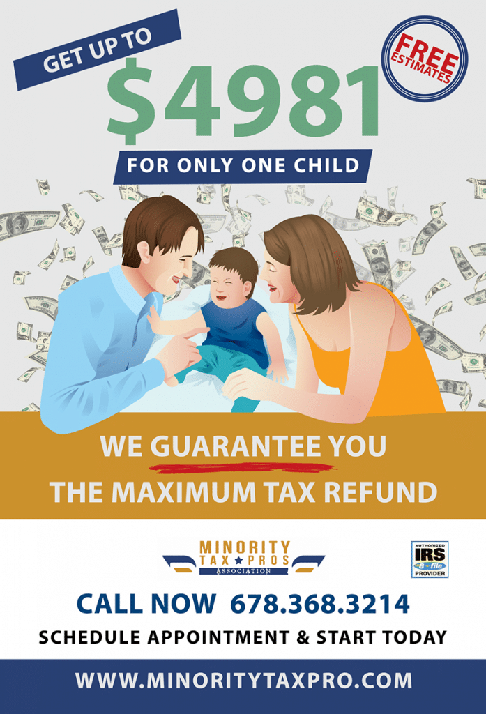 Minority Tax Pros services we have the experience and knowledge to help you with whatever questions you have and filing your taxes. At Minority Tax Pros our tax preparation professionals are virtual appointments available on Zoom Monday thew Friday from 8 am to 9 pm in Georgia and we’re open late plus weekends. We offer stress-free tax preparation and services environment that helps you file your income taxes and receive the maximum refund guarantee. Also, we can get you up to $6000 cash advance on your refund check and help you get a $4,981 child credit. Get started today!